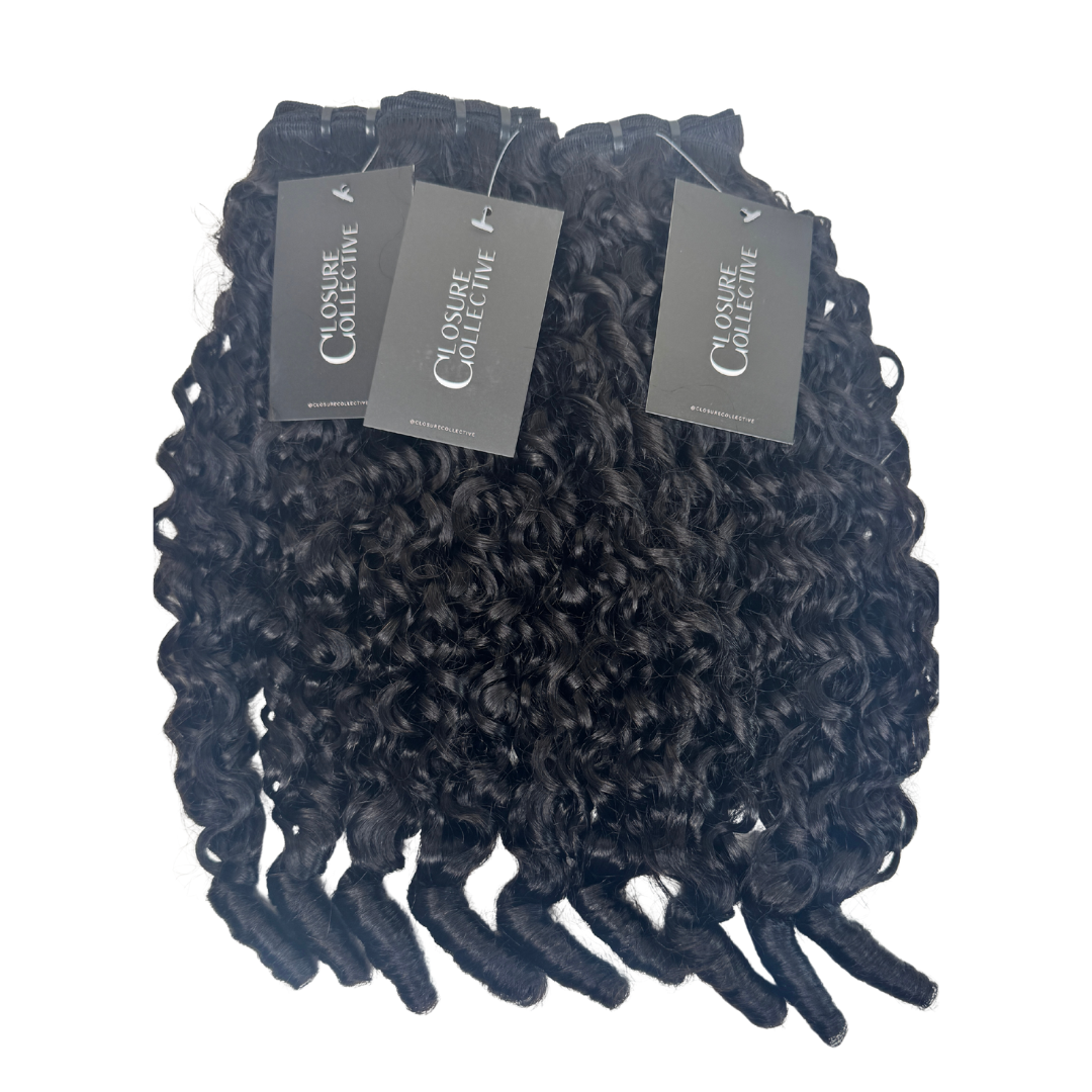3 bundles of Virgin Burmese Double drawn CC Curl hair extensions; offering long-lasting wear — ideal for both newcomers and experienced hair clients.